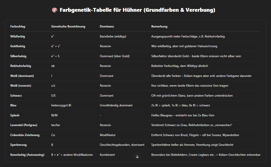 Wenn es bei Hühnern um Farbe und Muster geht, ist Genetik wie ein Überraschungsei: Man weiß nie ganz genau, was rauskommt – es sei denn, man versteht die Regeln dahinter.
